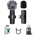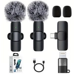 Mikrofon zewnętrzny krawatowy bezprzewodowy z odbiornikiem USB-C Typ-C + Adapter do Apple Lightning iPhone Android + DeadCat osłona przeciwwietrzna Vlog Podcast YouTube TikTok Stream Transmisja (2 szt.)