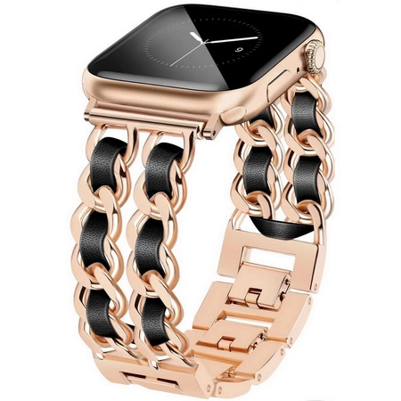 Bransoleta Glow CNL Stainless Steel Leather Band ozdobny pasek do Apple Watch 4/5/6/7/8/9/10/11/SE 1/2/3 40/41/42mm (Rose Gold / Różowe złoto/ Czarny)
